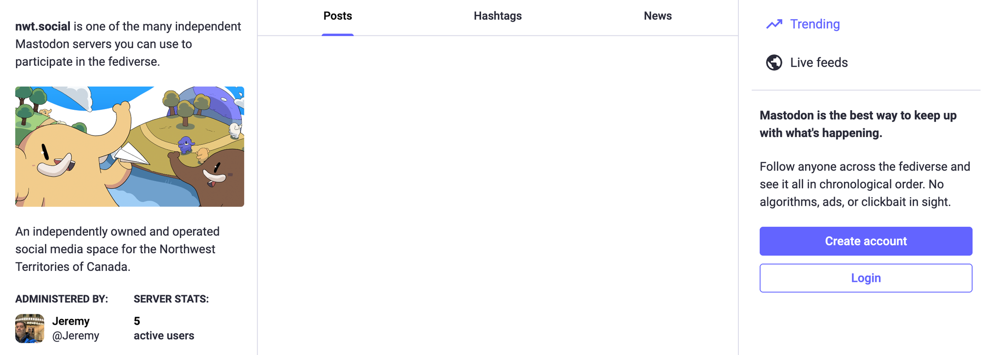 When you search for nwt.social the first result is usually this instance, you click it and will land on a Mastodon instance and the default feed. If you want to learn about the co-op you have to look around the instance to find something linking to their website because Mastodon doesn't make it super easy to add an obvious "Go To Our Actual Website" custom links bar at the top of each page.